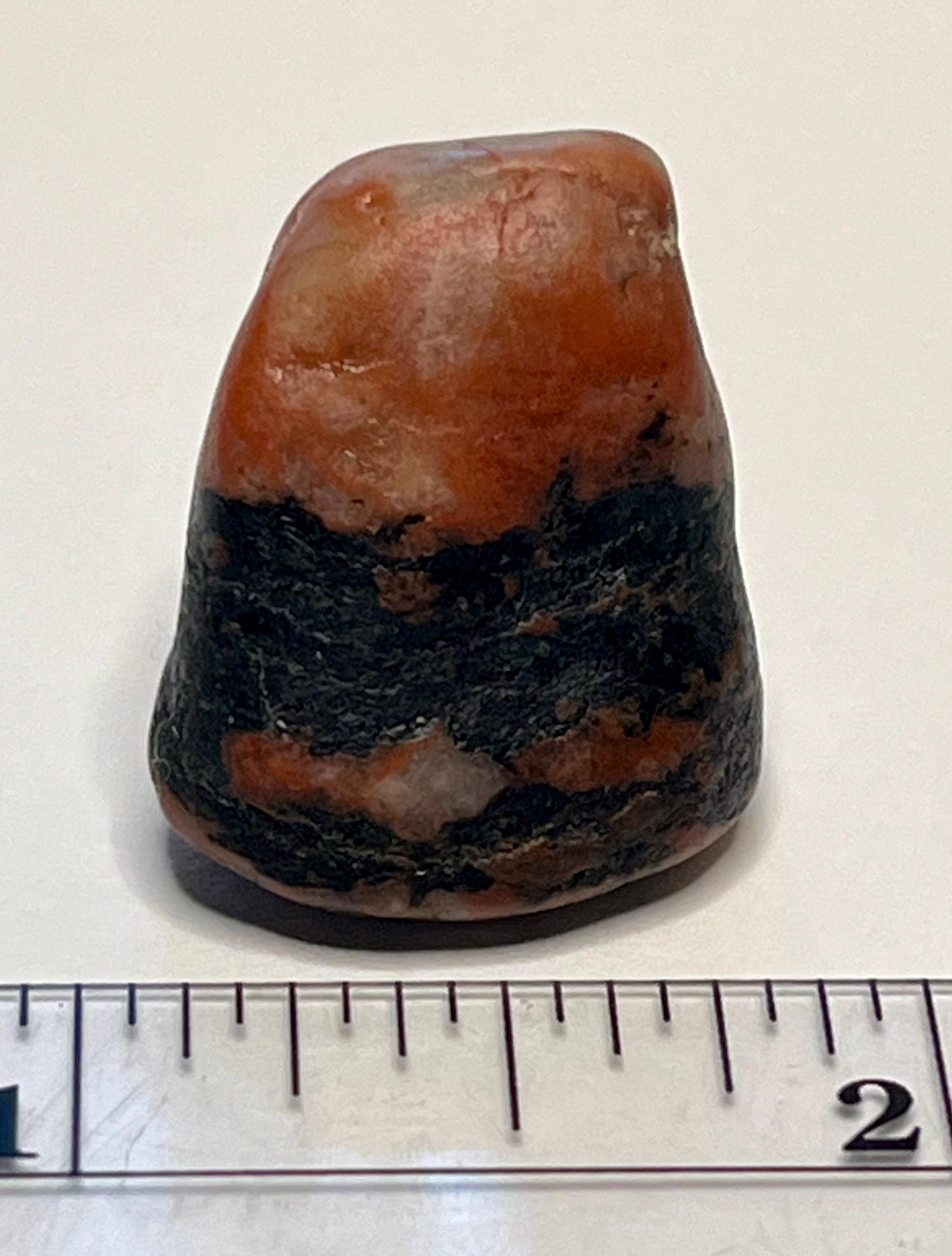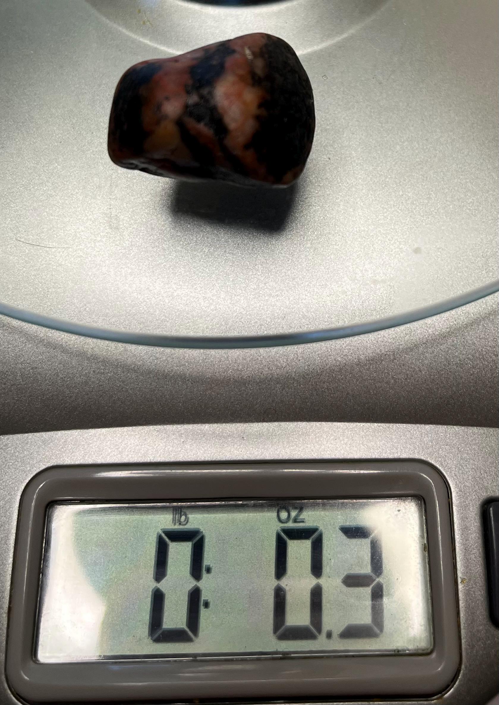 This listing is for one (1) stage-1 tumbled banded sardonyx agate, measuring approximately 1 inch and weighing 0.3 ounces (42.5 carat weight). This unique stone features striking black and reddish-brown banding with a mostly black underside, giving it an elegant, dramatic look.